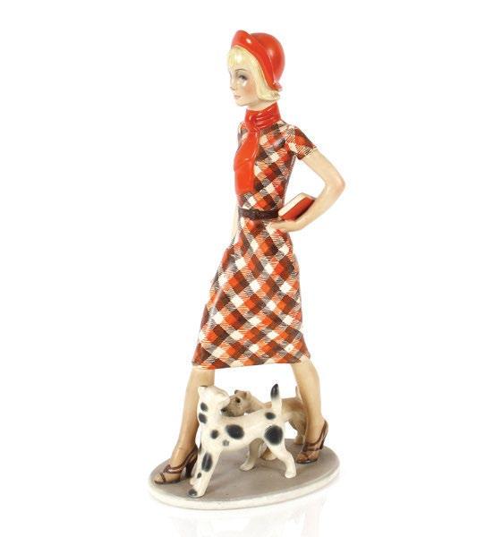 Lenci Torino, study of a young woman in checked dress striding out with her terrier dogs, red book under her arm, initialled to base C.M. 26-11-XIII, 39cm high –SoLd for £2,500.