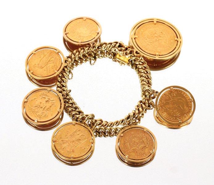 A 14ct gold bracelet hung with seven gold coins including 1918 Veinte Pesos, 1935 Swiss 20 Franc, a 1919 $5, a 1931 full sovereign, an 1897 10 Guilder, an 1877 Belgian 20 Franc, a 1909 French 20 Franc, approx. total weight 111gms – SoLd for £3,000.