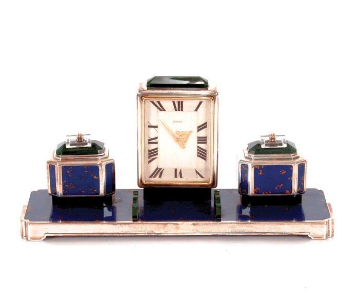 A Cartier silver Nephrite and enamel mounted desk clock with integral pen tray and inkwells, complete with original silk lined tooled leather case, 29.5cm –SoLd for £27,400.