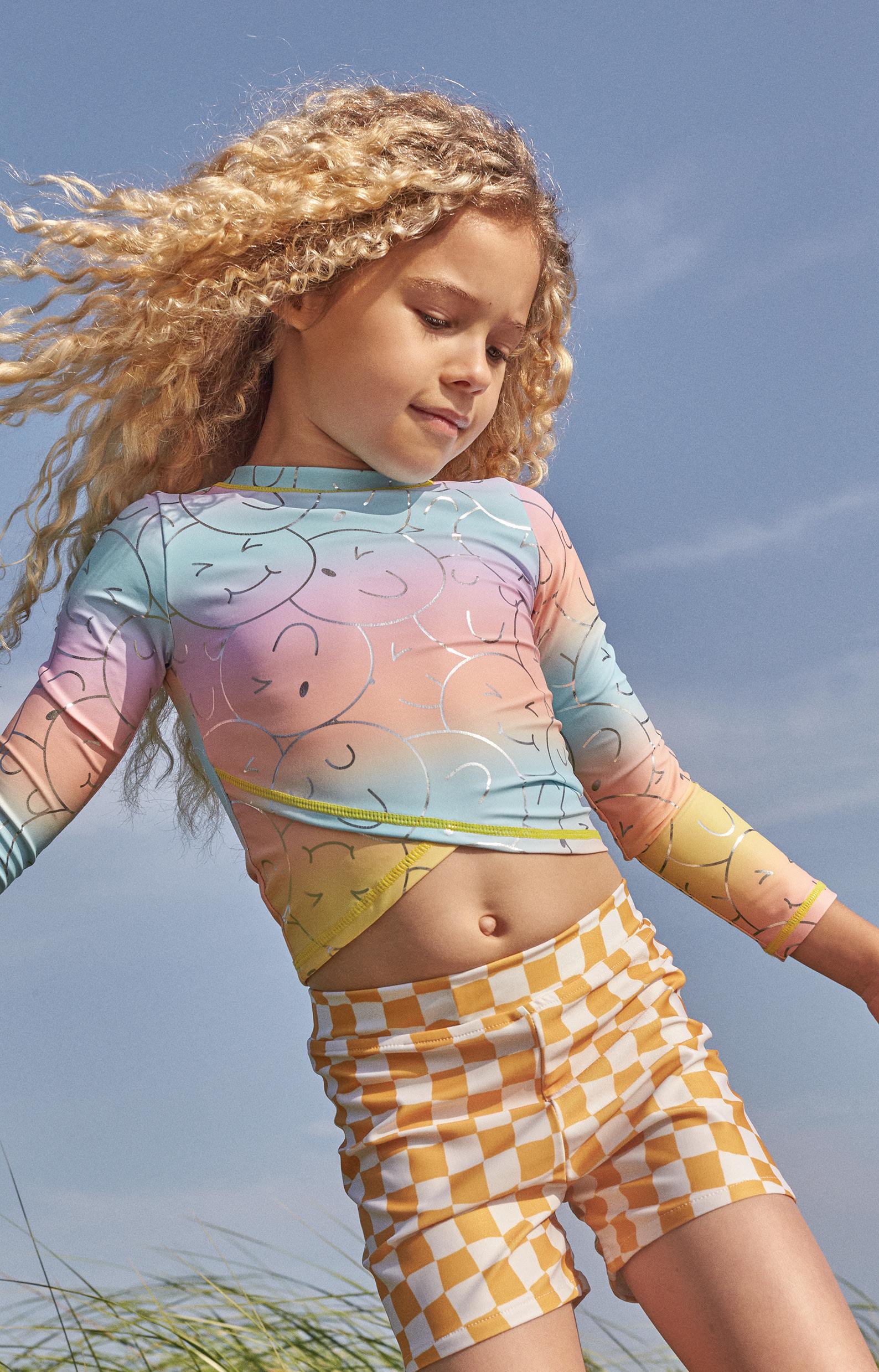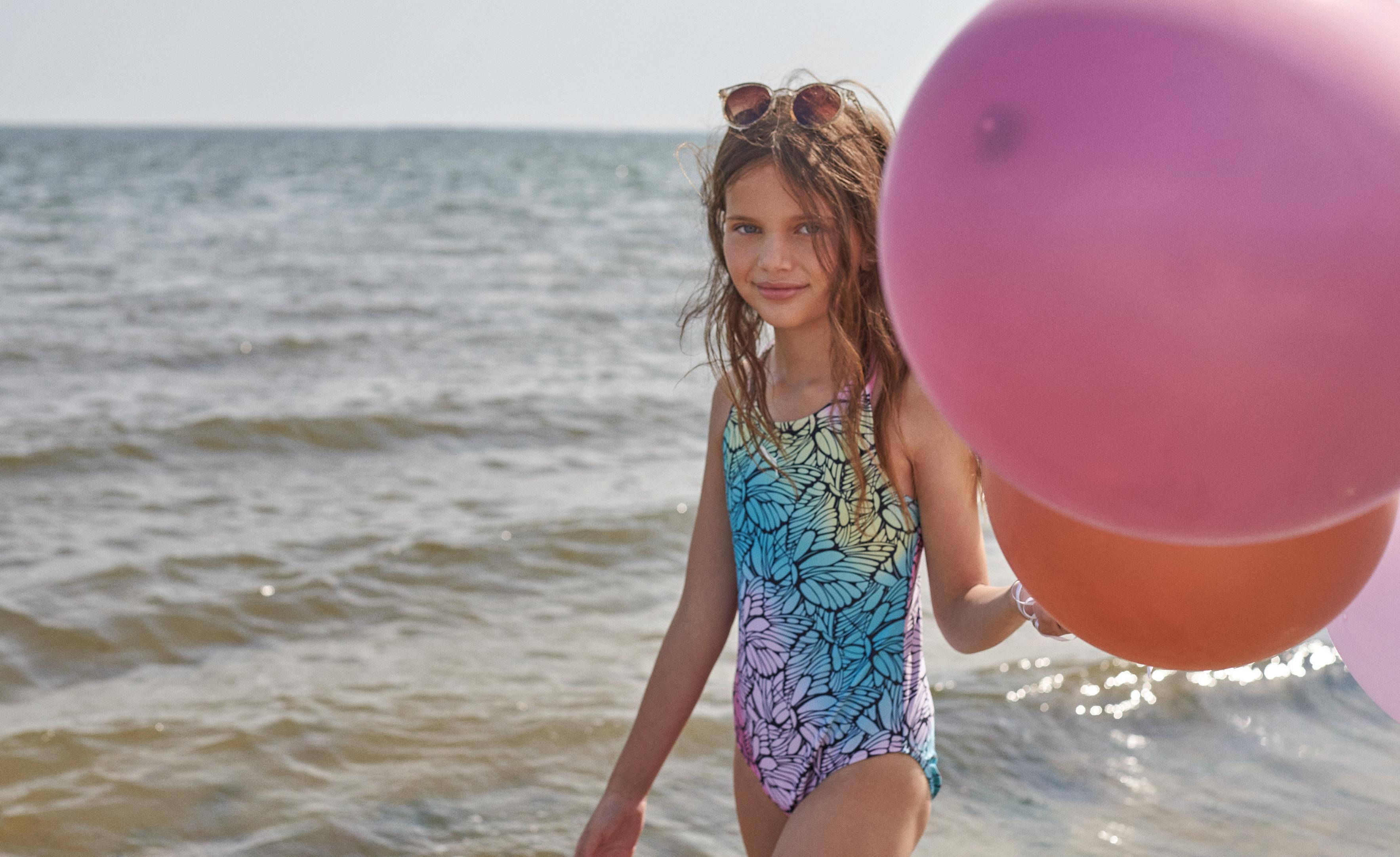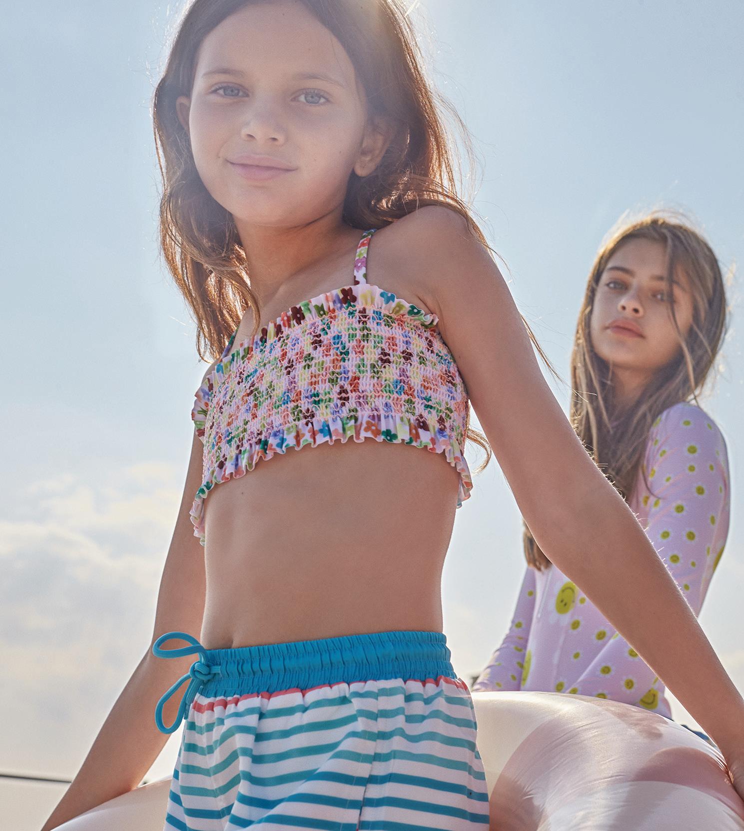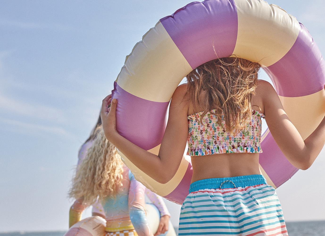 Keep young customers sunsafe in tropical suits, adorable hats, cushiony sandals, and fun-yet-functional sunglasses.