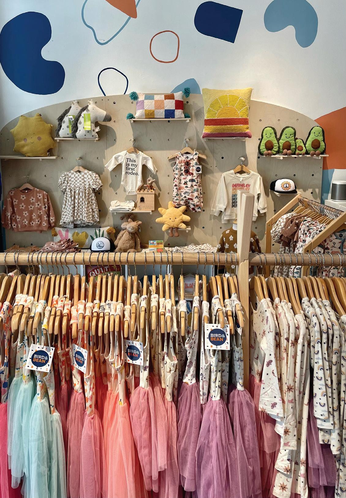 Bird & Bean literally borders Oakland and Berkeley; the wall inside her store is official dividing line. Each side of the store is approximately 1,100 square feet—one side for kids and the other for adults, but with the newly knocked-down wall, the space is essentially one big store. Parents, caregivers and grandparents stock up on Rylee + Cru, Quincy Mae, Pink Chicken, Me + Henry (see Designer Profile on pp 38 - 39), Angel Dear, Blueberry Hill, City