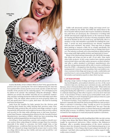 1. UP YOUR OPTIONS Keeping a large variety of slings and wraps in stock and providing knowledgeable, personalized attention are two of the most common ways you can keep your customers at ease, said Giselle Baturay, owner of Granola Babies in Costa Mesa, Calif. “What will work for one person is not going to work for the next person,” she explained, noting that finding the right fit for a customer’s size, baby and lifestyle is a delicate balancing act that often requires a lot of in-store trial and error. “A lot of times I’ll hear a mom say [a carrier] didn’t work, and I want to ask, ‘When you went shopping for jeans and you tried on a pair that didn’t work, did you give up on jeans?’” At Vachon’s boutique, every employee is required to read the manufacturers’ manuals and watch the instructional DVDs for each product. When a customer is selecting a sling, “usually we put it on ourselves and show them how to use it with a weighted doll,” she says. Then the customer practices with the product, to ensure that mom is comfortable and the baby is secure. In addition, Vachon keeps the CPSC guidelines on hand for her employees to read and properly explain to customers. 2. OFFER OUTSIDE HELP For parents who are having trouble bundling their little one into a wrap or sling, some shops, like Metro Minis, host their own weekly classes taught by experienced instructors. Other retailers, like Babymoon Boutique, offer a monthly demonstration of the store’s products. Baturay steers her shoppers towards a local babywearing group or an online community. “A lot of times, they’re just using it incorrectly,” she explained, “and that’s where getting that local or online support really, really comes in handy.” >55 E A R N S H AW S . C O M • O C T O B E R 2 0 1 0 3 3