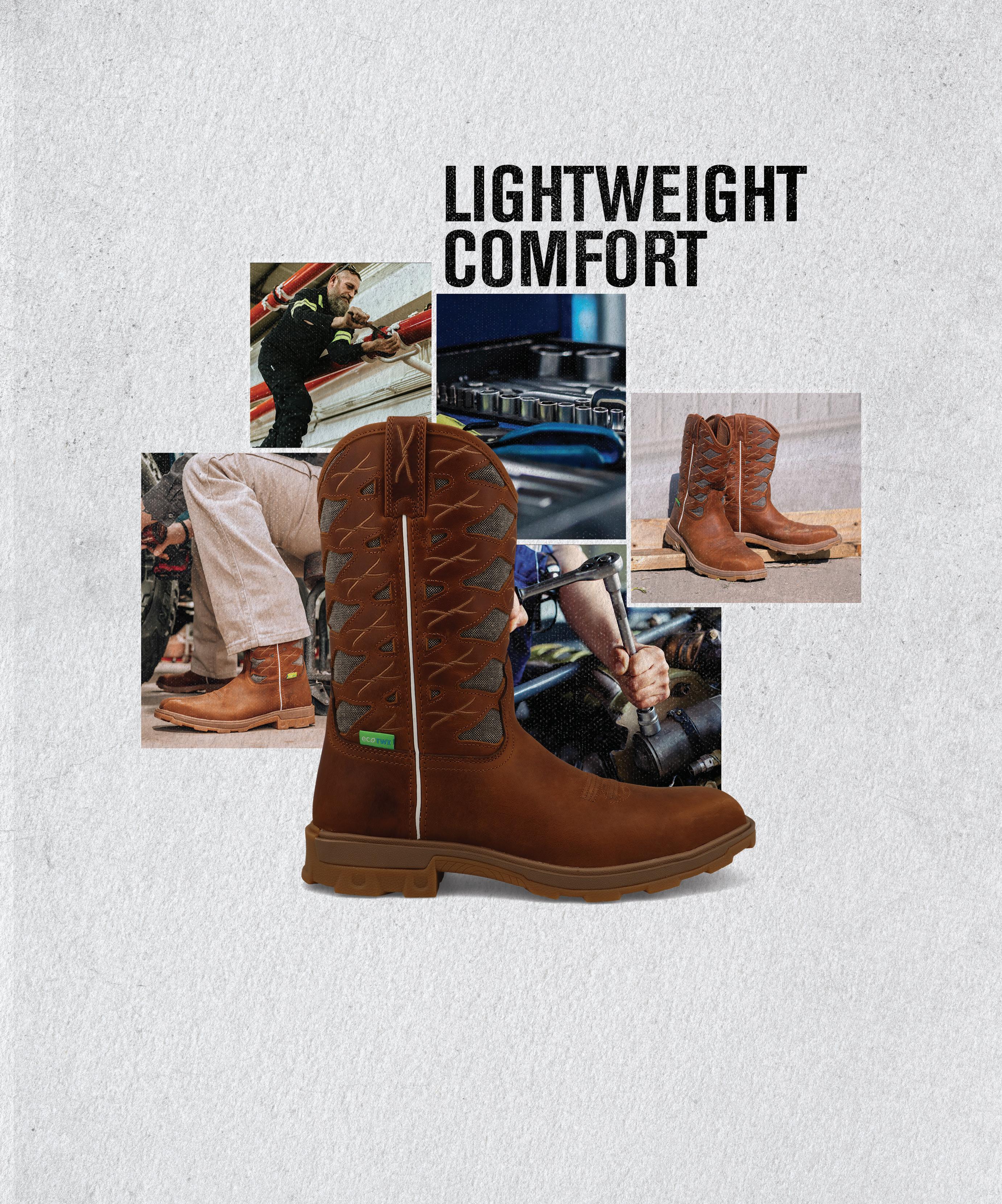 work, lifestyle, and Western styles—is another highlight. The unique EVA compound reduces weight by 20 percent. “The collection is selling so well, and we’re looking forward to showing retailers our new UltraLite X athleisure outsole,” he says. “It’s thicker and, paired with mesh and leather uppers, is a great new Western look. It’s very on trend for what’s happening in the marketplace right now.”