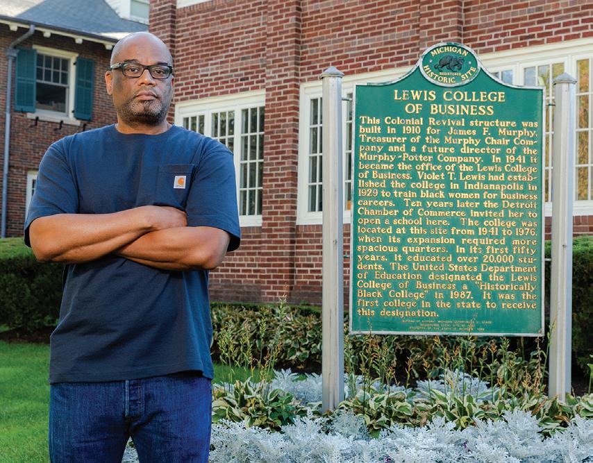 Edwards in front of the former home of the Lewis College of Business, Michigan’s only HBCU, that will reopen as PLC.