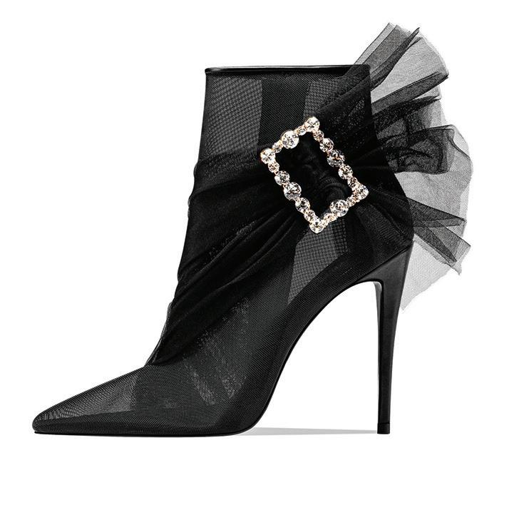 What are some highlights of your latest collection? I’m bringing back a few styles with my signature heels but with more pops of color. I’m also introducing more leathers as well as silks and satins with my usual twists on accessories. For example, my Latoy bootie, which is one of my current faves, features a mesh, windswept tulle crossbody drapery paired with a vintage crystal brooch. It’s unique and fashion-forward looking. It’s foot candy for your soul!