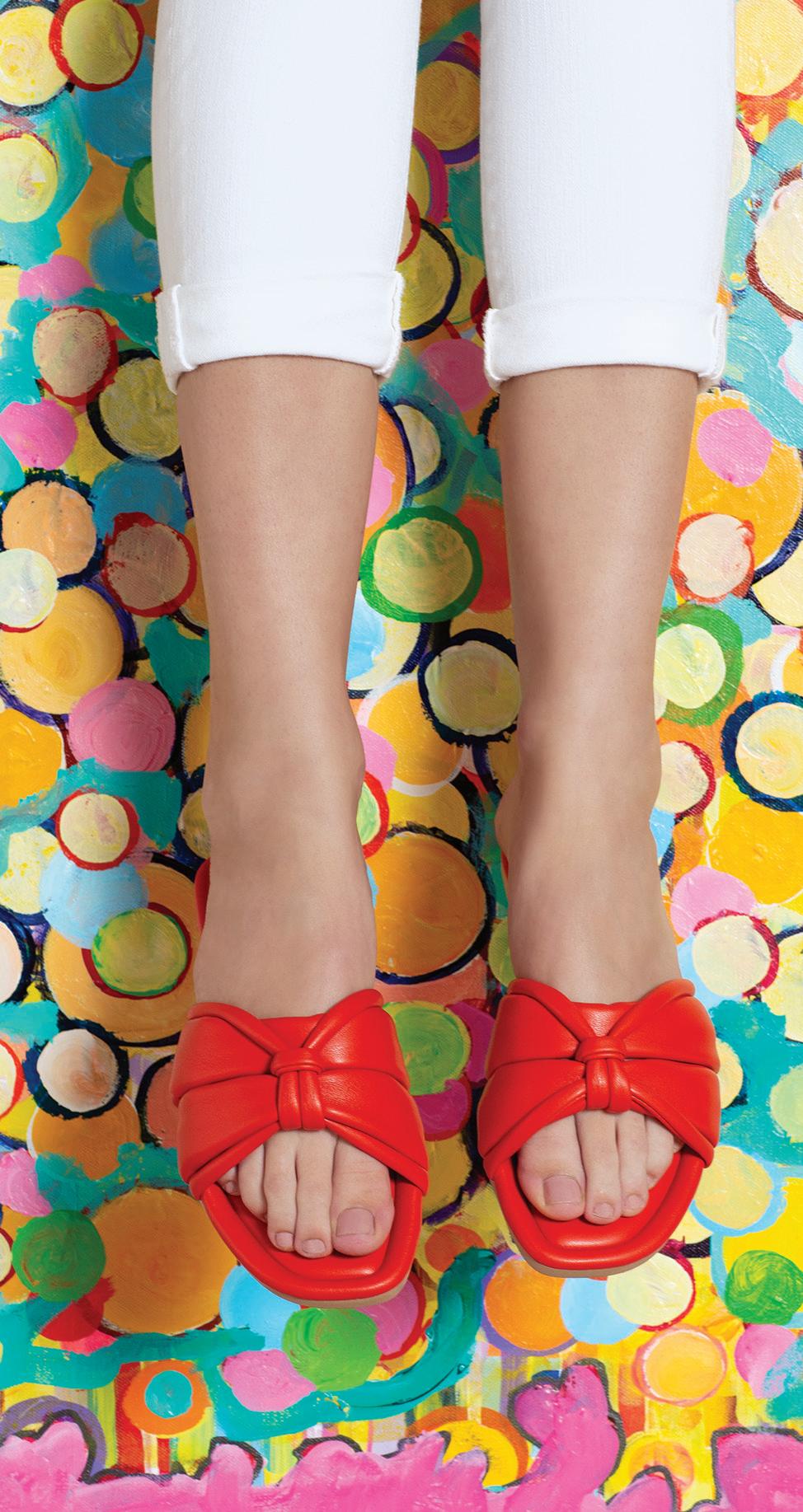 Clockwise from left: Elizée ruched leather strap sandals; Seychelles lark’s head knot slides; hurrache sandals by Diba True Opposite page: cowboy boots by Twisted X