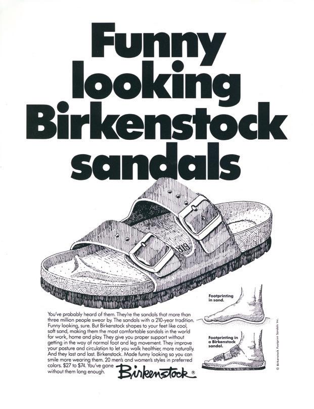 In the 1960s, an American tourist named Margot Fraser found her feet aching during a visit to Germany. She bought a pair of adjustable singlestrap Birkenstock sandals (now known as the Madrid) and was so impressed that, after she got home to San Francisco, she bought the rights from Karl to import and sell them in the U.S. Unfortunately, shoe retailers reacted much like the Düsseldorf crowd had. When they refused to carry the strange-looking shoes, Fraser approached health food stores instead. Her timing couldn’t have been better. It was the height of the hippie movement, and countless flower children who came into the stores to stock up granola and wheat germ were suddenly besotted with Birkenstock sandals. Natural materials? Earthy colors? Unpretentious, comfortable styling? The shoes seemed tailor-made for free spirits. When Birkenstock introduced a new model with a second strap (the now famous Arizona) in 1973, the hippies dug them too.