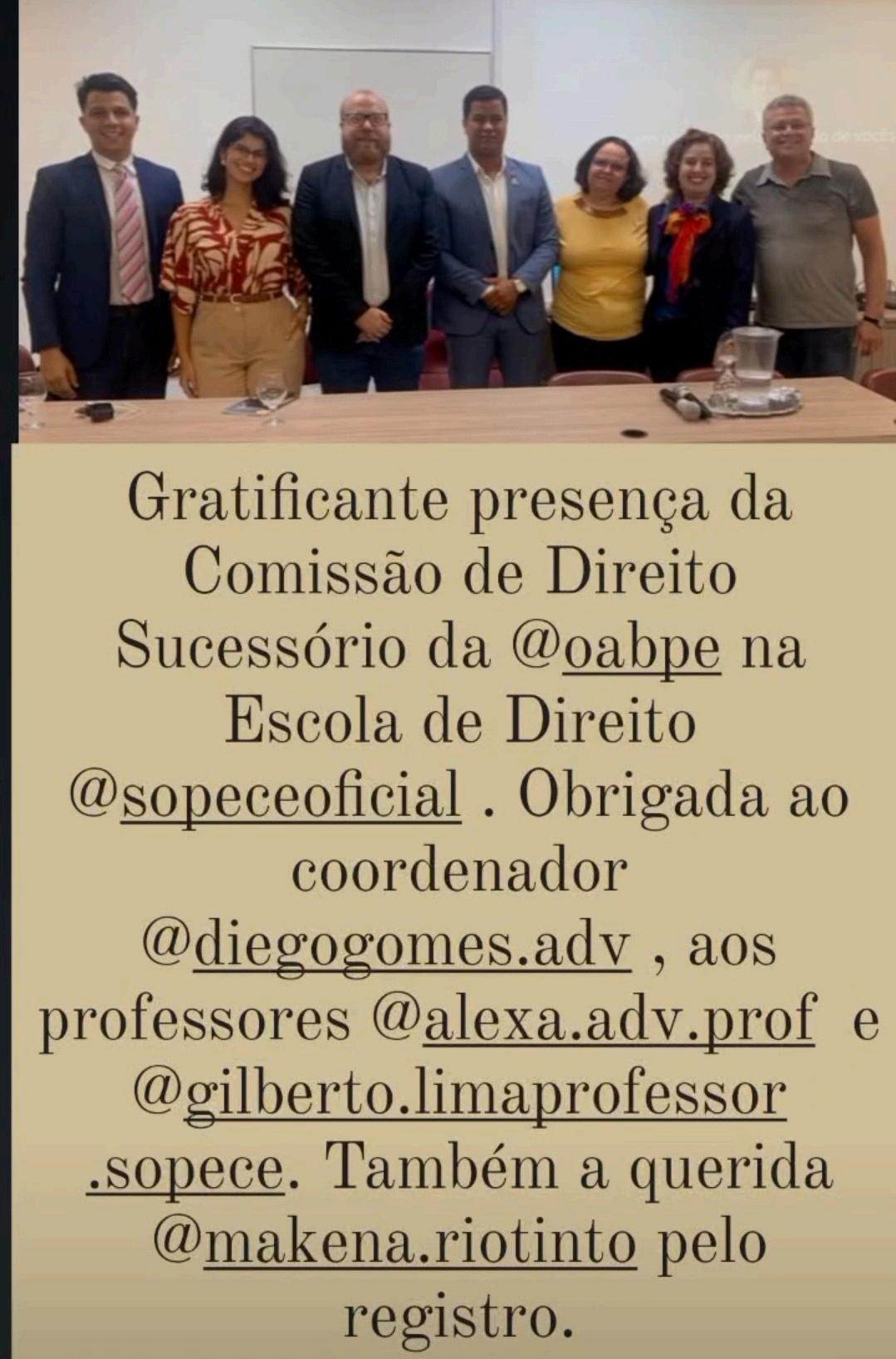 Presente na SOPECE A COMISSÃO DE DIREITOS SUCESSÓRIOS, com palestras dos advogados Mário Pedrosa, Paula Moneta e Bruno Xavier. Recebidos pela coordenação de curso e professores.