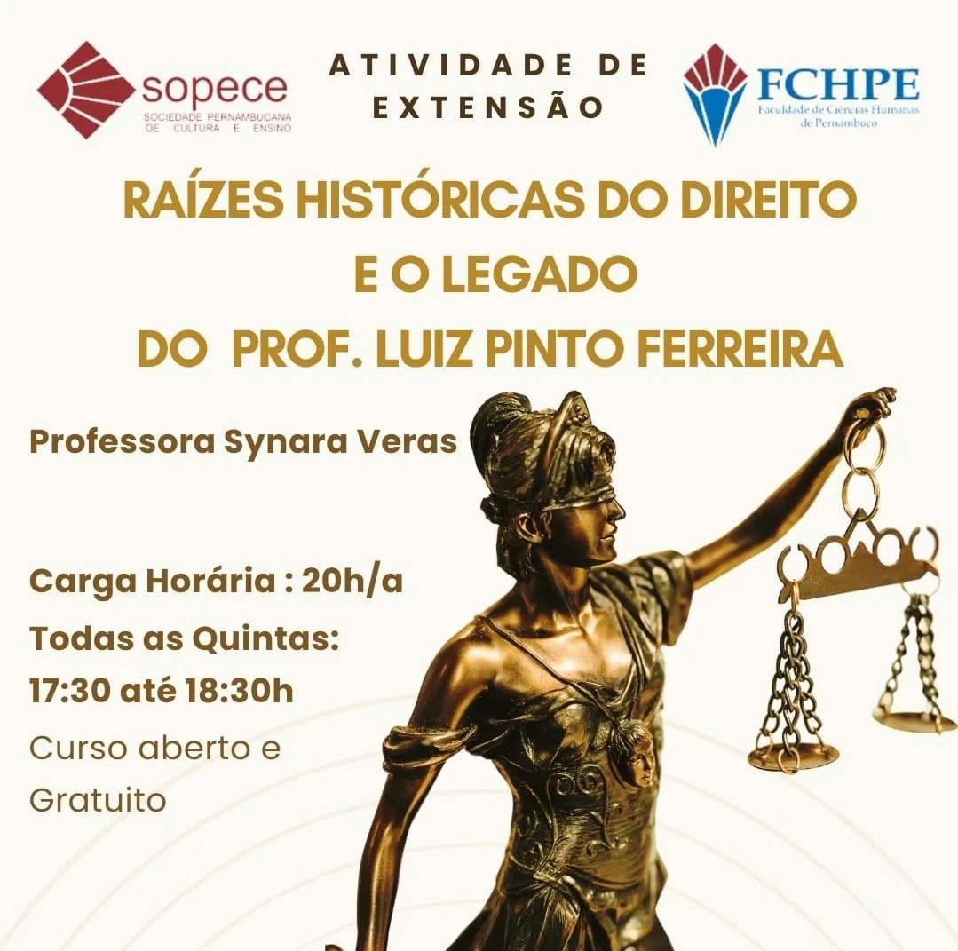 O curso de extensão HISTÓRIA DO DIREITO E O LEGADO DO PROFESSOR LUIZ PINTO FERREIRA iniciou com as aulas em março nas sextas-feiras das 18h às 19h, com um conteúdo programático sobre a História do Direito Geral (LAGES, 2018): o direito na antiguidade (sumeriano, egípcio, hebraico, indiano, grego, romano), medievo (contratos vassálicos, direito germânico, direito canônico, inglês) modernidade, contemporaneidade (absolutismo monárquico, iluminismo e revolucões).