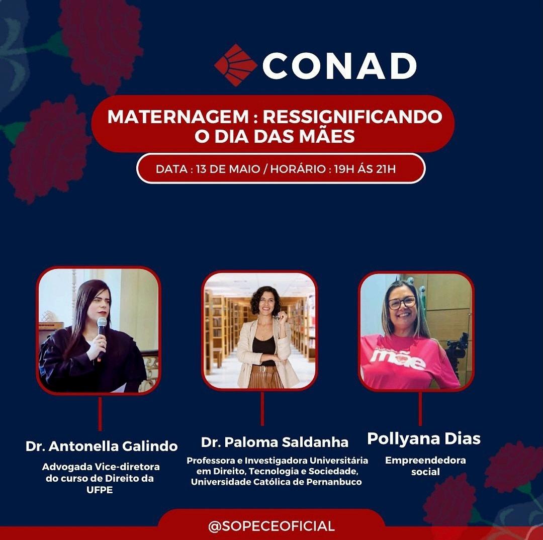 No CONADI 2024.1 a SOPECE proporcionou que na primeira noite, após o Dia das Mães, a reflexão sobre MATERNAGEM: RESSIGNIFICANDO O DIA DAS MÃES. Estiveram presentes, Antonella Galindo, Paloma Saldanha e Pollyana Dias.