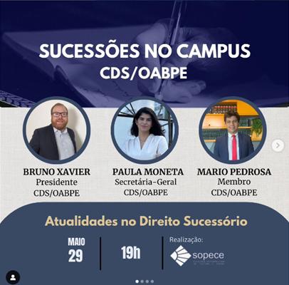 CONFORME A COMISSÃO DE SUCESSÓRIO DA OAB, O PROJETO TEM O INTUITO DE INTEGRAR E FOMENTAR O VÍNCULO ENTRE A OAB/PE E AS UNIVERSIDADES, OBJETIVANDO APRESENTAR AOS ALUNOS AS RECENTES DISCUSSÕES DO DIREITO SUCESSÓRIO.