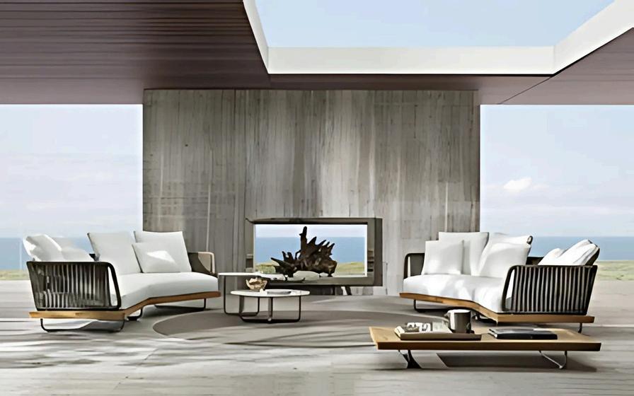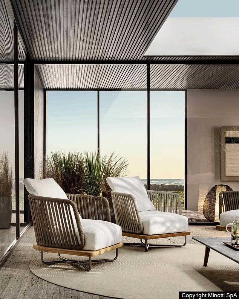 Sunray is designed both to play a leading role in outdoor settings and to complement the other furnishing pieces in the collection. It juxtaposes different shapes and materials: its airy surface in natural teak wood defines its horizontal line, while the curved backrest with interwoven cords gives it a dynamic allure.