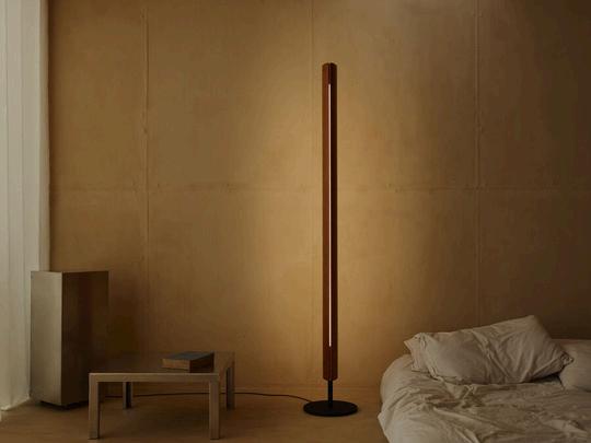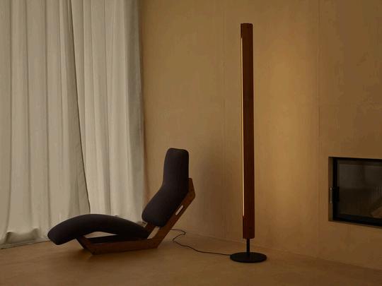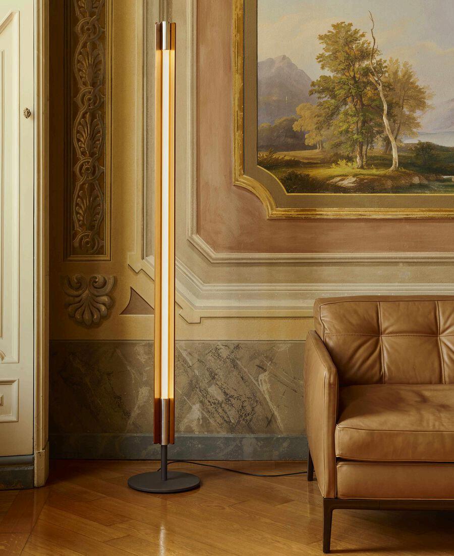 Floor lamp emitting direct and indirect light with symmetrical and asymmetrical distribution. Features two vertical ash wood blades joined by chromed metal fittings Blades rotate around a central tubular light source to allow variable light emission. Raw black iron base separated from the vertical blades by a collar. Custom-developed dimmable linear LED light source The lamp can also be fitted with standard T8 LED tubes.Designed by Tobia Scarpa in 1963 and reissued in 2025, Seki-Han is testament to his mastery of design and wood-working expertise The intricate construction draws on naval techniques to shape two wooden blades that now rotate around the light source. Even when almost completely closed, a sliver of light remains visible, creating a highly poetic effect.