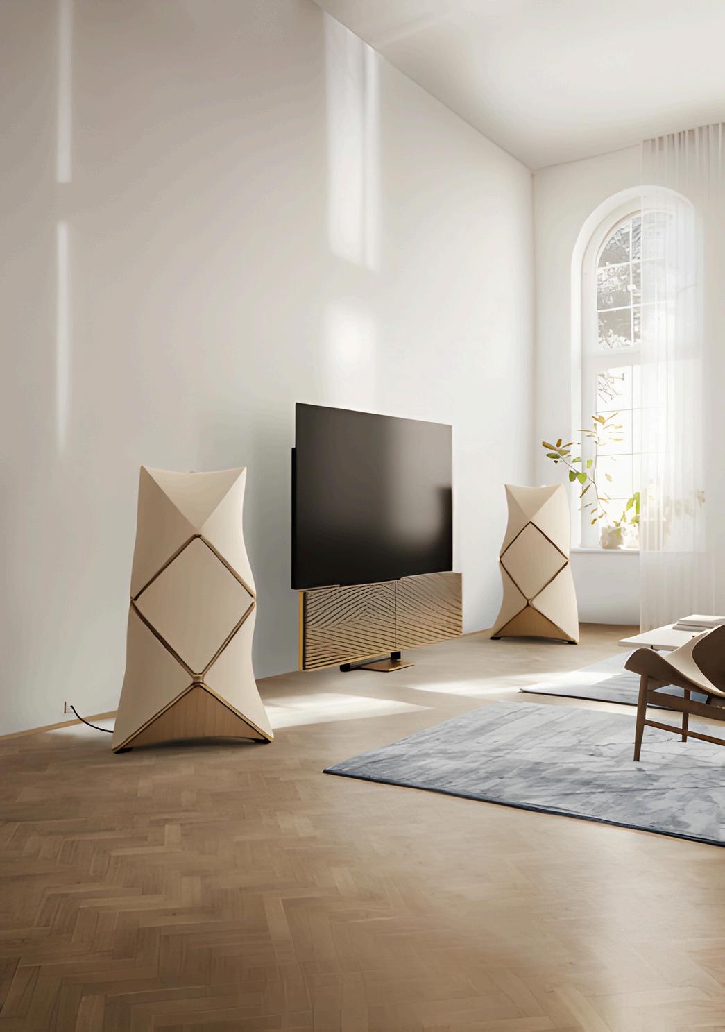 Sculpted from wood or fabric and aluminium, Harmony catches the eye and invites conversation even in standby mode. And when you're ready to watch, it puts on a show. The powerful speakers glide apart, the television floats into the space. A performance that takes movie moments to new heights. Absolute clarity of speech Full-bodied, detailed stereo With this three-channel powerhouse, the sound of cinema has never felt closer. Want to experience even deeper immersion? With the built-in intelligent surround sound processer, Harmony works seamlessly with Beolab speakers to boost the bass, amplify the accuracy and totally submerge you in sound.