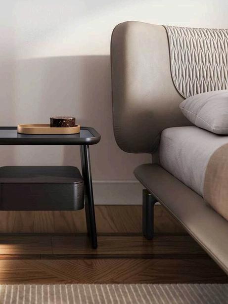 A light layer of padding wraps around the entire profile of the base. The suspended padded headboard extends beyond the frame, creating a wraparound effect, and features removable decorative quilting with matalassé stitching. The cylindrical legs are made of aluminum, upholstered in Pelle Frau® leather to match the bed.