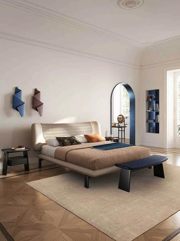 The DUO designer bed reinterprets the hallmark elements of the DUO collection, such as the curved lines, seen here in the headboard The structure is made of steel, with a base composed of struts in lime or tulip wood.
