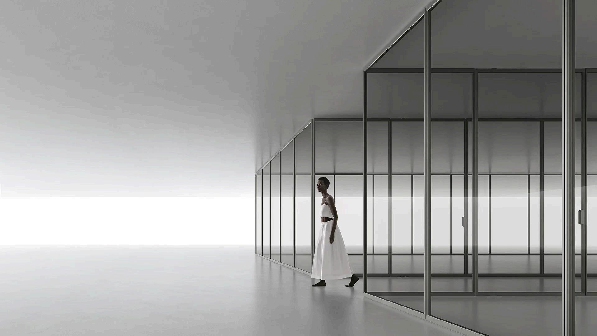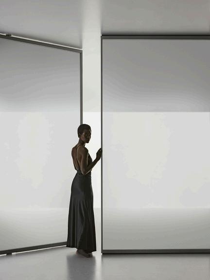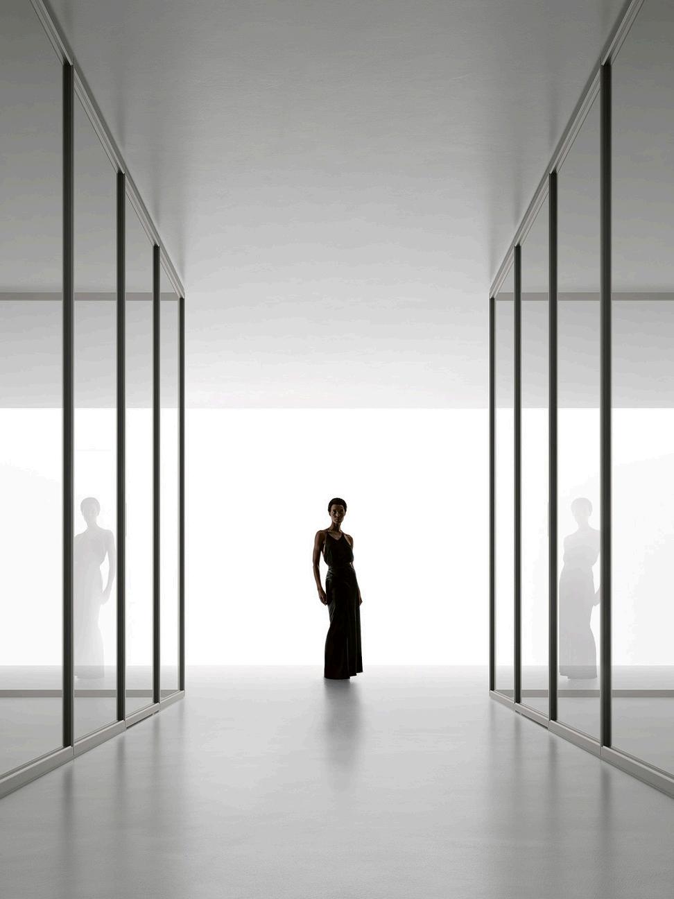 Maximum freedom in defining space is the aim of Air System, a system of fixed panels, in the center of the room or on the wall, flanked by pivot or bidirectional swing doors, which allows you to create linear, corner or T-shaped compositions.