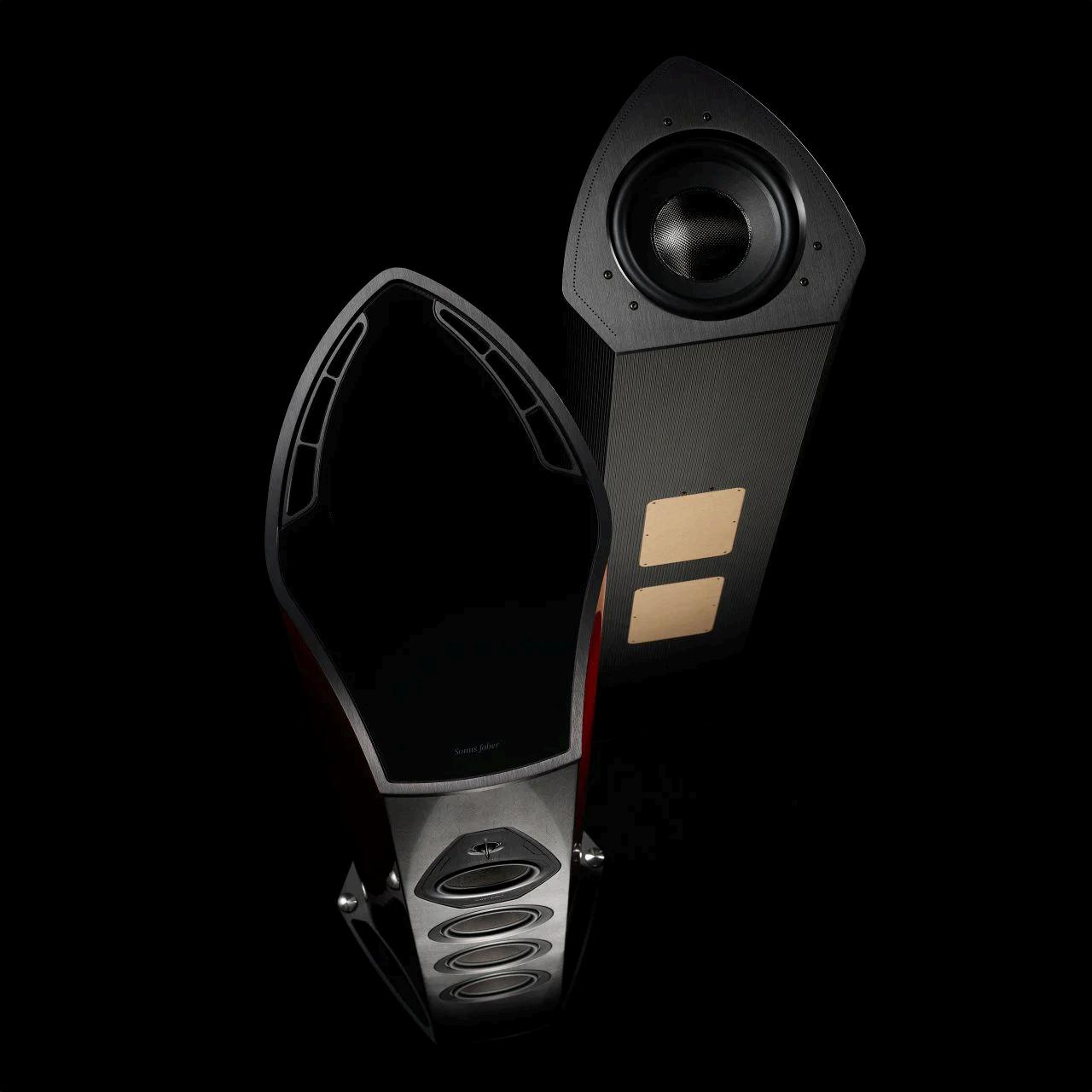The lyre-shaped front cabinet, designed for forward sound emission, ensures structural strength and efficient energy management. Meanwhile, the rear cabinet, designed for infralow frequencies, eliminates resonance with strategic reinforcements. Lilium's front and rear cabinets use different materials – finely grained hard walnut wood for the front and soft leather for the rear - a design that reinforces the duality of the speaker’s engineering philosophy