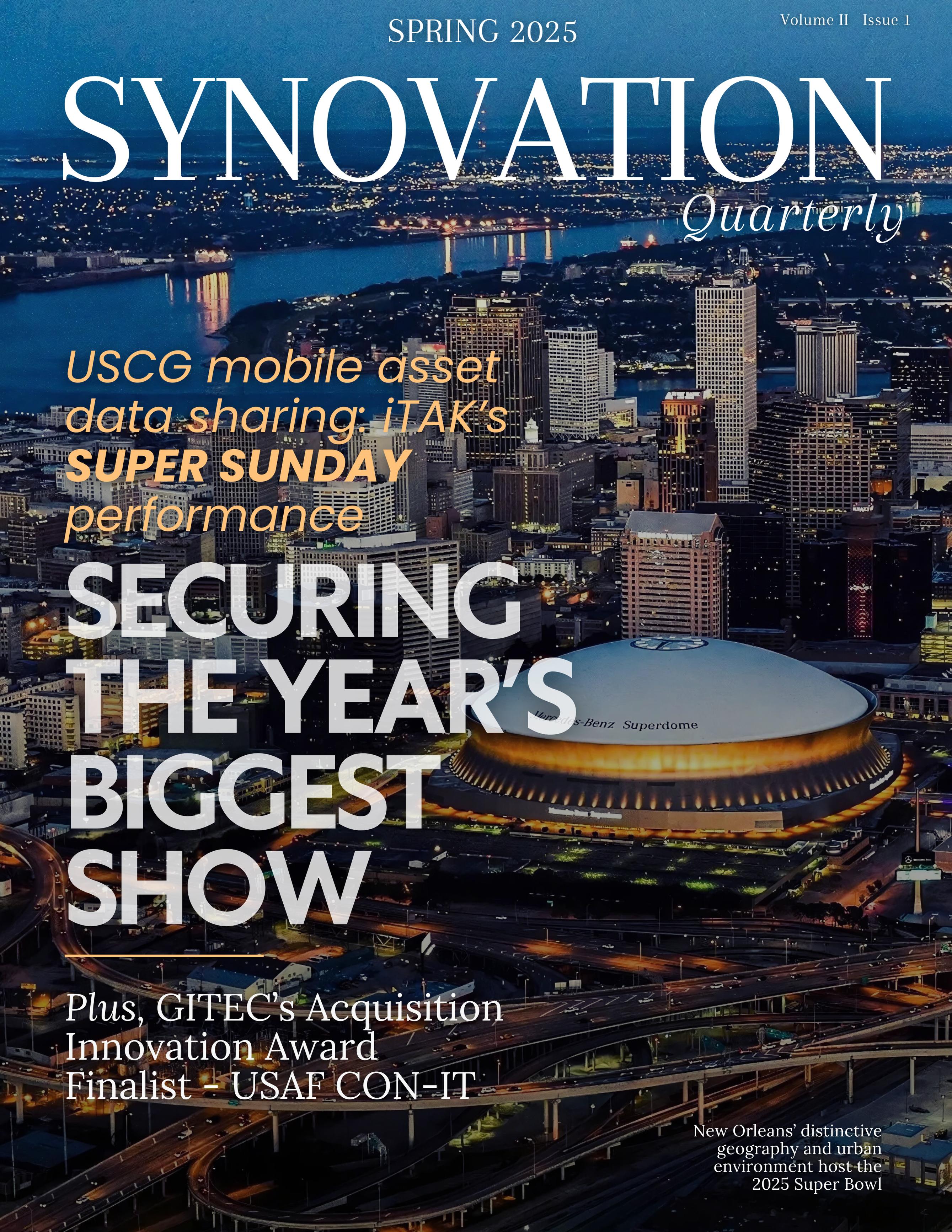 The cover of this Spring 2025 edition of Synovation Quarterly features a captivating nighttime aerial view of New Orleans, showcasing the brilliantly illuminated Caesars Superdome. This vibrant image symbolizes not only the excitement and allure of Super Bowl LIX but also the sophisticated and collaborative security operations quietly working beneath the surface. The glowing Superdome, standing prominently against the city’s iconic skyline, reflects the vigilant watchfulness enabled by cutting-edge technologies and interagency cooperation.