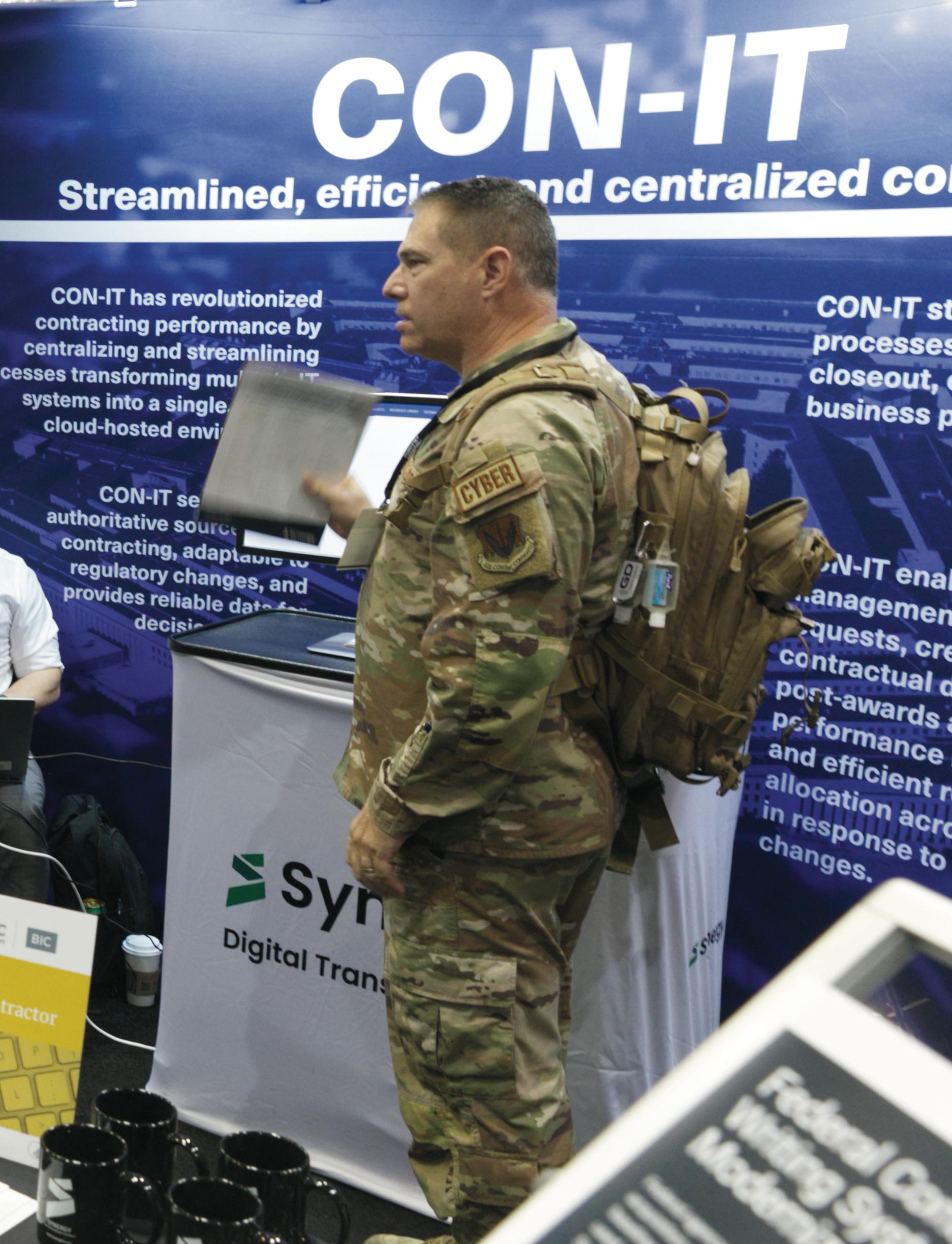 BELOW: At the Synergy CON-IT exhibit duringDAFITC2024inMontgomery,AL, Synergy’s Managing Director Steve Hofinger, CON-IT Program Director George Sarmiento, and Director of Innovation Daniel Streicher discuss CON-IT’s role in modernizing defense acquisition through Agile, low-code solutions and cross-service collaborationwithUSAFattendees.