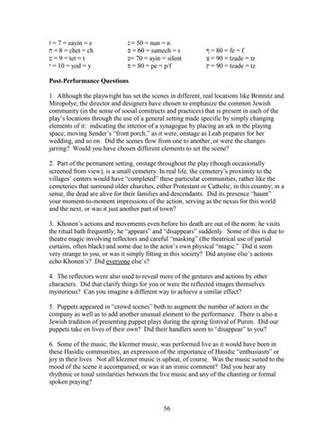 Post-Performance Questions 1. Although the playwright has set the scenes in different, real locations like Brinnitz and Miropolye, the director and designers have chosen to emphasize the common Jewish community (in the sense of social constructs and practices) that is present in each of the play’s locations through the use of a general setting made specific by simply changing elements of it: indicating the interior of a synagogue by placing an ark in the playing space; moving Sender’s “front porch,” as it were, onstage as Leah prepares for her wedding, and so on. Did the scenes flow from one to another, or were the changes jarring? Would you have chosen different elements to set the scene? 2. Part of the permanent setting, onstage throughout the play (though occasionally screened from view), is a small cemetery. In real life, the cemetery’s proximity to the villages’ centers would have “completed” these particular communities, rather like the cemeteries that surround older churches, either Protestant or Catholic, in this country; in a sense, the dead are alive for their families and descendants. Did its presence “haunt” your moment-to-moment impressions of the action, serving as the nexus for this world and the next, or was it just another part of town? 3. Khonen’s actions and movements even before his death are out of the norm: he visits the ritual bath frequently; he “appears” and “disappears” suddenly. Some of this is due to theatre magic involving reflectors and careful “masking” (the theatrical use of partial curtains, often black) and some due to the actor’s own physical “magic.” Did it seem very strange to you, or was it simply fitting in this society? Did anyone else’s actions echo Khonen’s? Did everyone else’s? 4. The reflectors were also used to reveal more of the gestures and actions by other characters. Did that clarify things for you or were the reflected images themselves mysterious? Can you imagine a different way to achieve a similar effect? 5. Puppets appeared in “crowd scenes” both to augment the number of actors in the company as well as to add another unusual element to the performance. There is also a Jewish tradition of presenting puppet plays during the spring festival of Purim. Did our puppets take on lives of their own? Did their handlers seem to “disappear” to you? 6. Some of the music, the klezmer music, was performed live as it would have been in these Hasidic communities, an expression of the importance of Hasidic “enthusiasm” or joy in their lives. Not all klezmer music is upbeat, of course. Was the music suited to the mood of the scene it accompanied, or was it an ironic comment? Did you hear any rhythmic or tonal similarities between the live music and any of the chanting or formal spoken praying?