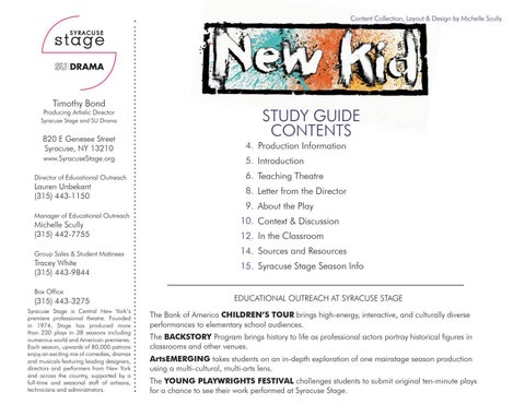 EDUCATIONAL OUTREACH AT SYRACUSE STAGE The Bank of America CHILDREN’S TOUR brings high-energy, interactive, and culturally diverse performances to elementary school audiences. The BACKSTORY Program brings history to life as professional actors portray historical figures in classrooms and other venues. ArtsEMERGING takes students on an in-depth exploration of one mainstage season production using a multi-cultural, multi-arts lens. The YOUNG PLAYWRIGHTS FESTIVAL challenges students to submit original ten-minute plays for a chance to see their work performed at Syracuse Stage.