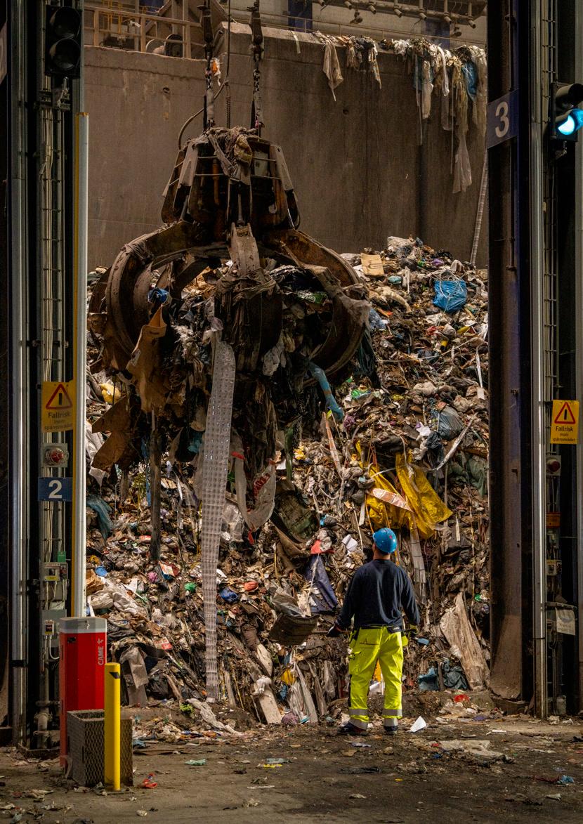 ■ Med hjälp av sorteringsskopor sorteras olika fraktioner ut på Spillepengs avfallsanläggning. Under 2023 utvecklade Sysav en ny sortering av fyra olika typer av plaströr, läs mer på sidan 53.