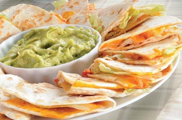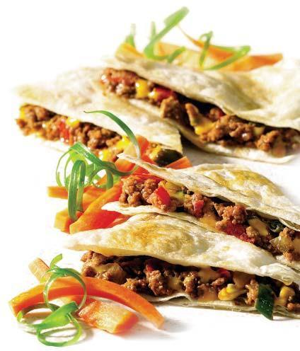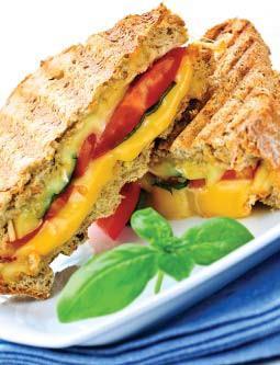 Wrap tortilla using the burrito fold. Cut in half. Garnish with a grape tomato.