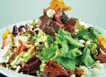 Butcher’s Block beef tenderloin served with butter blend salad mix, roasted tomato, crumbled bleu cheese, candied walnuts and balsamic glaze.