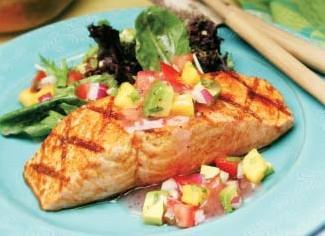 Heat a pan medium high, spray well with pan coating, season with salt and pepper, sear, and roast salmon until desired doneness. In a bowl, combine the mango, avocado, tomato, scallions, red onion, and cilantro.