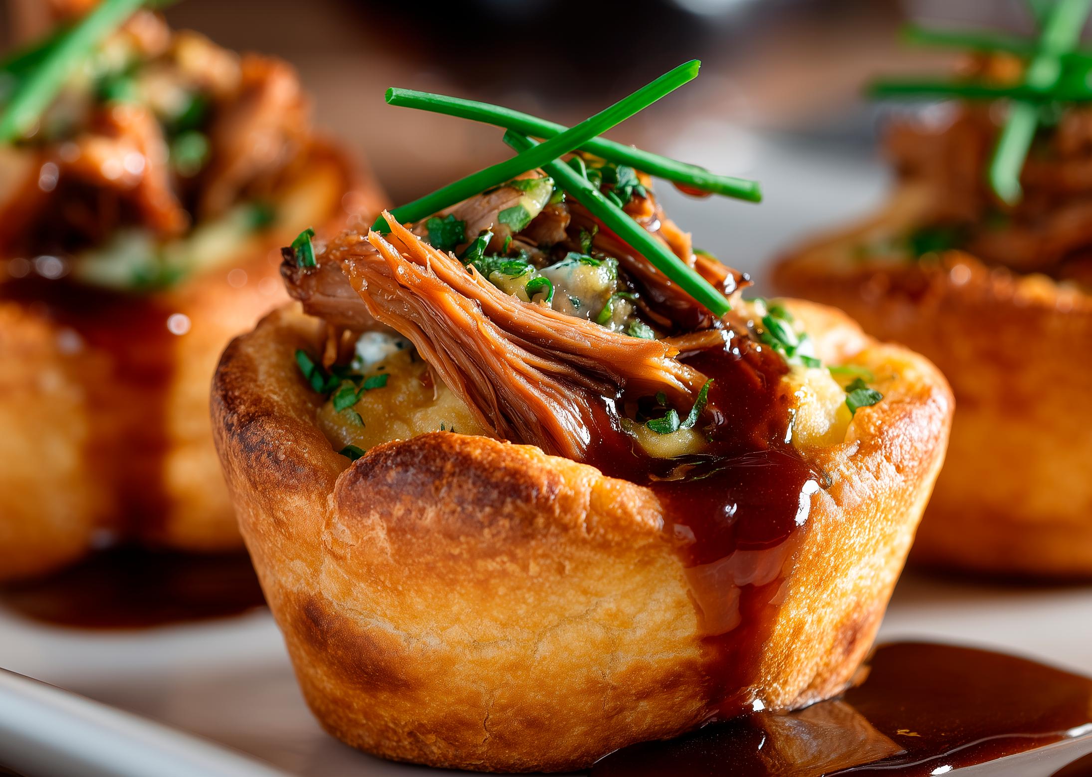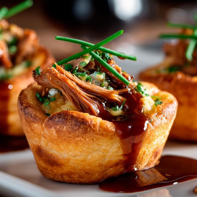 Perfect for après-ski, treat your guests to comforting classics like shredded beef with demi sauce served in Yorkshire pudding. Finish with a creamy touch of cheese such as Boursin or brie.