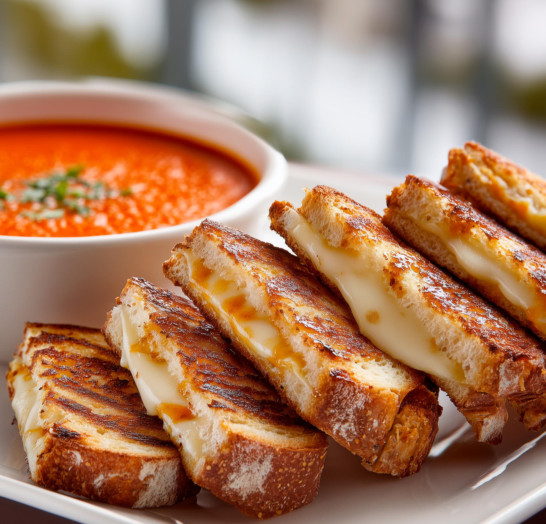 Golden, buttery grilled cheese sandwiches cut into perfect dippers and served alongside a rich, velvety tomato soup. A classic pairing made for dunking—comfort food at its finest.
