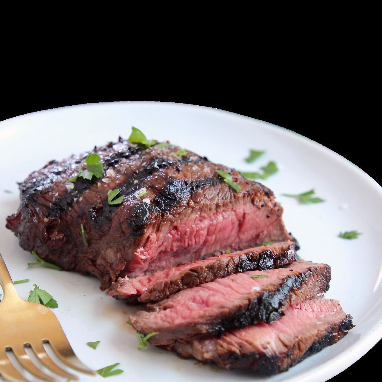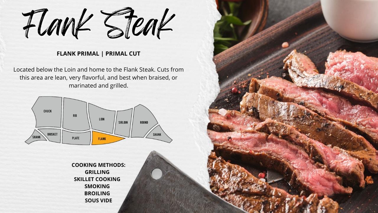 Flank steak is a cut of beef steak taken from the abdominal muscles of the cow, located just behind the plate and in front of the rear quarter. It is a long, flat cut with a significant grain, and is known for its bold flavour.