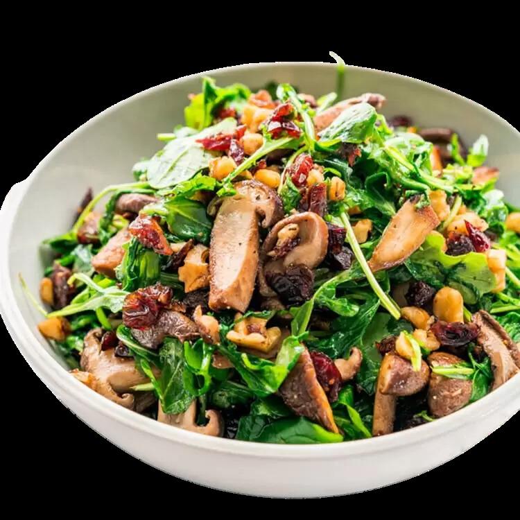 This Warm Mushroom + Arugula Salad is all you need for an amazing lunch. Toasted walnuts, perfectly sautéed mushrooms, dried cranberries and peppery arugula, with Sysco Balsamic & Olive Oil Dressing.