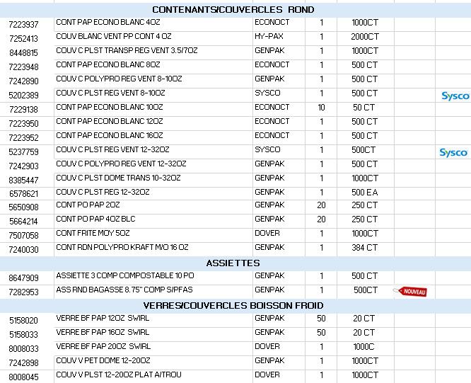 896744 OLIVE VERTE CASTELVETRANO ENT ROLAND 4 2.5 KG 1745314 OLIVE NOIRE DENOY MOY CONS ROLAND 6 #10 4876775 OLIVE MEL MUFFULETTA NEW ORLEAN ROLAND 4 56 OZ 7264170 PATATE FRITE SPIRALES ENR.LEG. A/P MCCAIN 6 5 LB 2812780 PATATE FRITE GAUFFRE ENR. A/PEL. MCCAIN 6 4.5LB 7284036 HDC ROND.POMME DE TERRE SEL&POIVRE SG MCCAIN 6 4 LB 357149 CROUST POMME DE TERRE CHIPPER A/P SG MCCAIN 6 4LB 4720838 HDC CORNICHON POINTE PANE SG MCCAIN 4 4 LB 4849472 HDC BOUCHEE MACARONI FROM SG MCCAIN 6 3 LB 5273150 HDC BAT MOZZA PAN SG SYS IMP 1 5LB 5546407 HDC OIGNON RNDL GOURMET 5/8 SURG SYS IMP 6 2LB 7288951 MAYONNAISE CLASS STYLE MAISON CHAUD. FABBRIC 1 15 LT 7289252 MAYONNAISE CLASS. STYLE MAISON FABBRIC 2 3.78LT 7289258 MAYONNAISE CLASS STYLE MAISON PORT. FABBRIC 140 25 ML SUPC Description Marque Unité Format Nouveau Marque Sysco