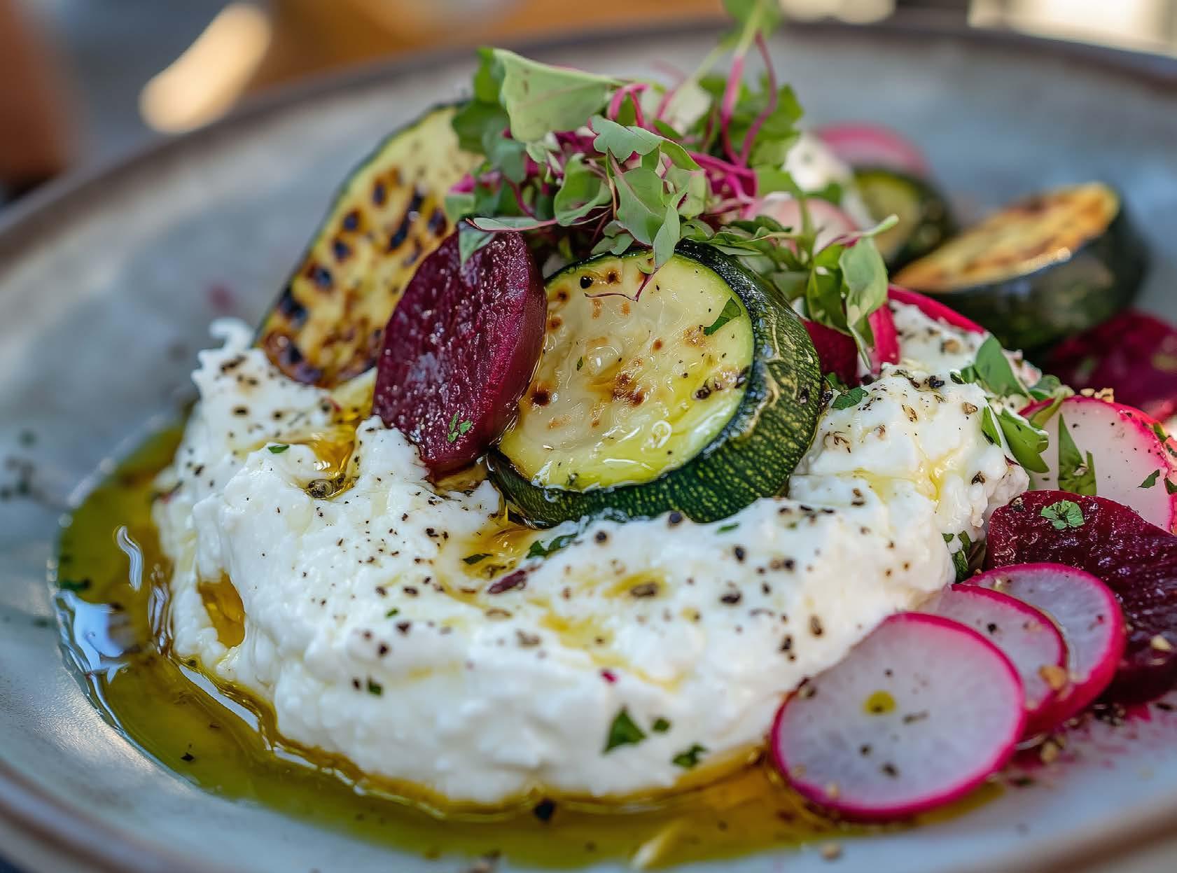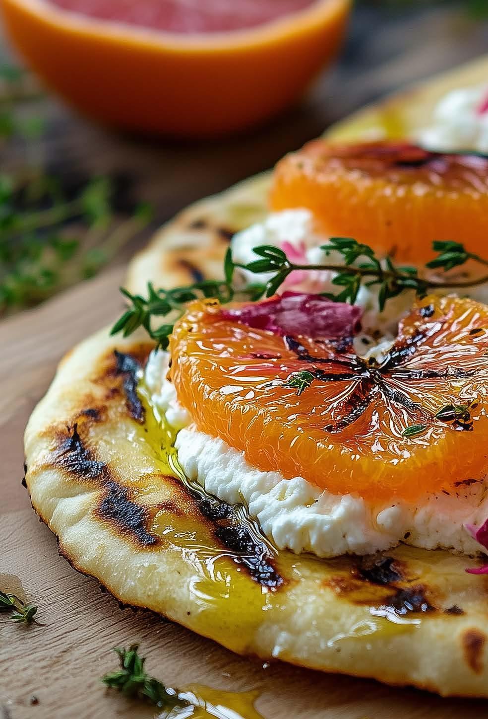 This enticing dish features grilled flatbread topped with sweet caramelized honey grapefruit, creamy ricotta, and a drizzle of fresh thyme and rosemary oil, complemented by shredded radicchio.