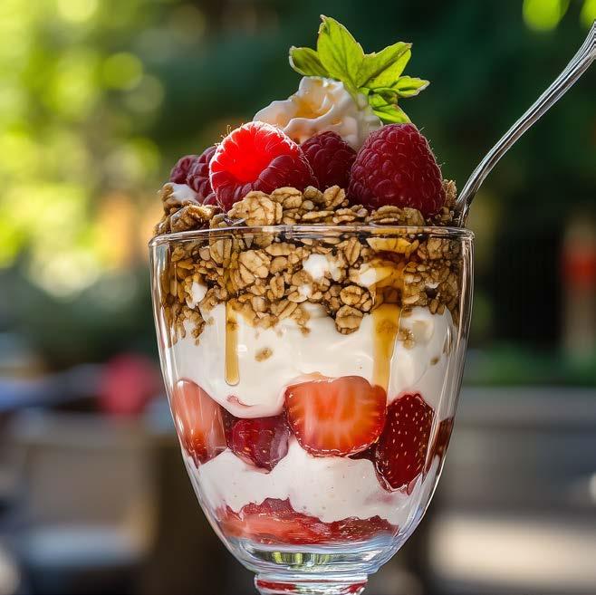 Layers of fresh seasonal berries, creamy mascarpone, and crunchy granola, creating a delightful and light dessert perfect for a warm evening.