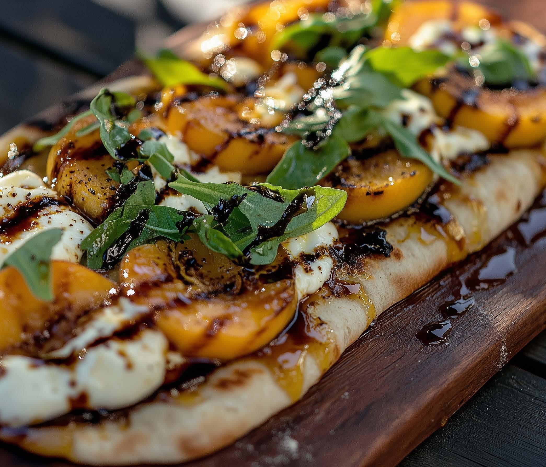 Hot Honey Grilled Peach & Burrata Flatbread combines juicy grilled peaches, creamy burrata, peppery arugula, fresh basil, and gooey mozzarella on a flatbread.