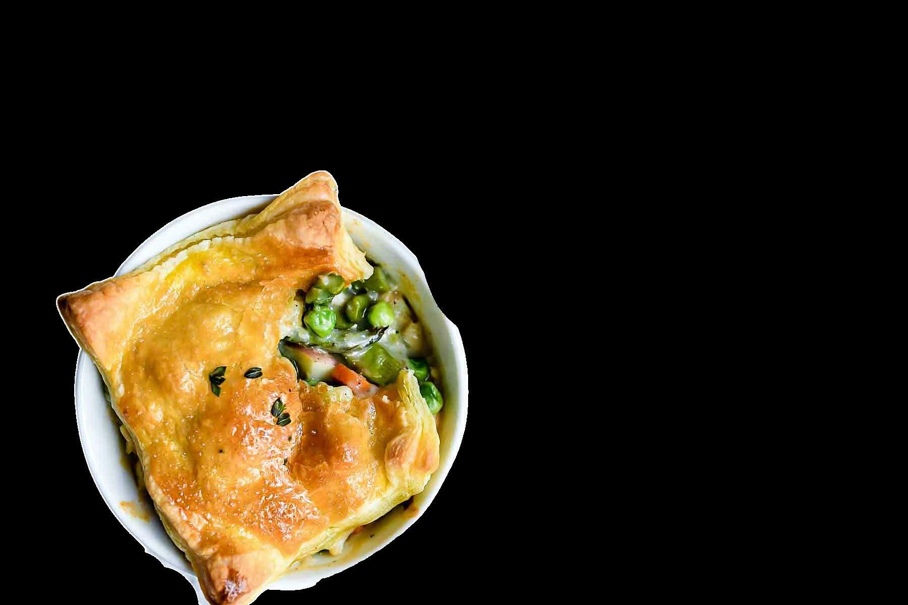Roll out 1 sheet of pie crust, cut into quarters, and lay pieces on top of the ramekins. Seal edges and trim excess dough Brush the tops with egg wash, then make 2 small slits in each so steam can escape Bake until crusts are golden brown and the filling is bubbly, about 30 minutes. (Watch carefully and tent with foil the last 10 minutes of baking if crust is over-browning.)