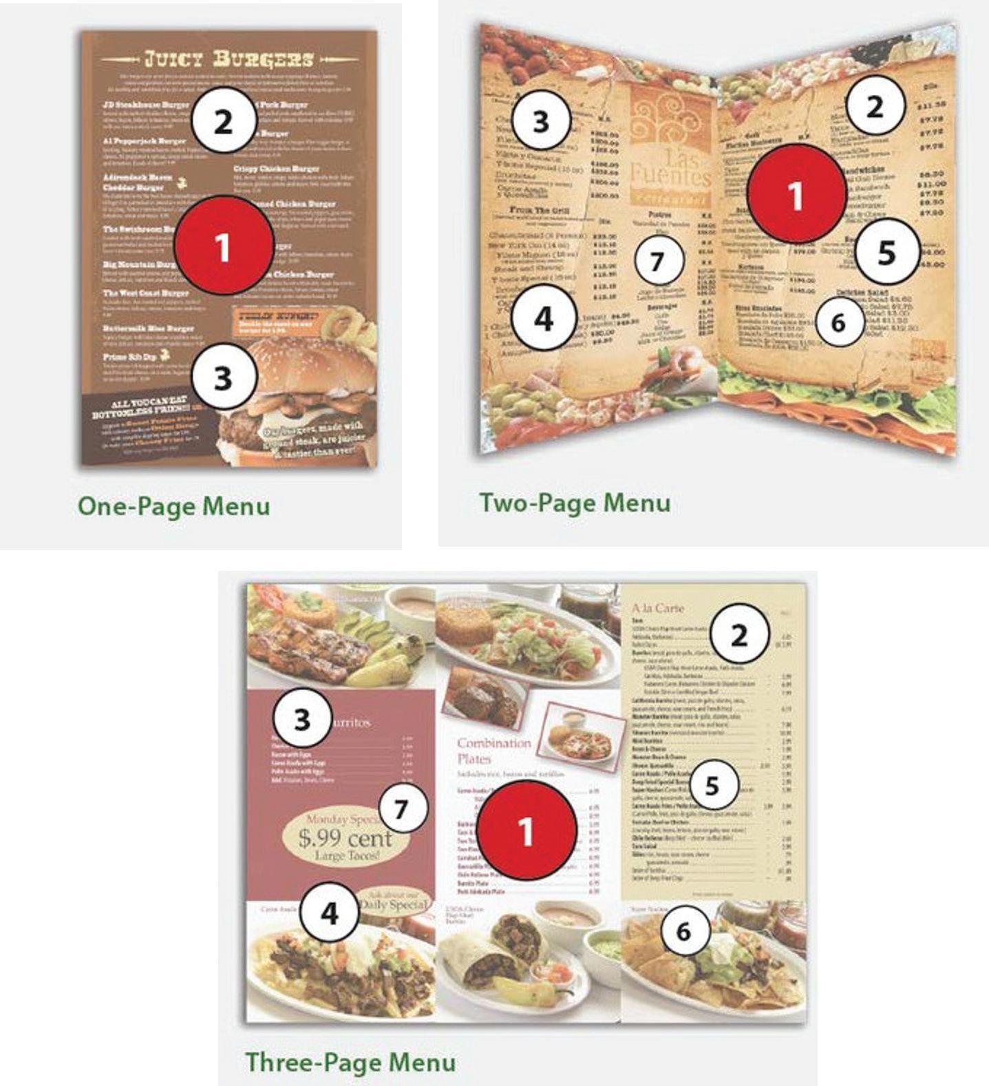A person looks at a menu for an average of 109 seconds on a constant loop. The reader’s eye follows a predictable, critical path as it scans the page. Therefore, in order to maximize profit potential, the position and placement of your most profitable items in eye-catching spots increases the likelihood of them being ordered. Your primary goal is placing the highest gross profit category in the number one position on the menu.