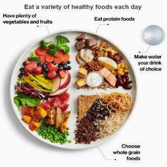 • Eating plenty vegetables and fruits, whole grains, and protein foods (choose plant-based protein more often)