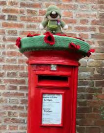 Membersof thecraft groupthat meetsweekly inthevillage hallhave knittedand crocheted poppies,as wellasa topperforthe postboxto remember andhonourmembersofthearmed forceswholosttheirlivesinthe courseoftheirduty. Thepoppieshavebeenplaced aroundthevillageatvarious locations.