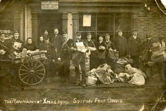 the20thcentury,fromhowchildren amusedthemselves,thelocal schools,cinemainSyston,how peoplespentChristmas,theannual fairandlocal clubsand societies. Chapterson local industries,the healthservice andsome prominent Systonmen andwomen alsooffer fascinating insightsinto lifeinthepast. Ifyoualready havebookone youcanbe surethatbook two complementsbookoneperfectly. Ourphotofrombooktwoshowsthe staffofSystonPostOffice photographedoutsidetheofficeon eitherChristmasEveorChristmas Day.Itisentitled‘TheRemnants, 1909.’AmazinglySystonPostOffice isstillinthesamebuilding113years later!