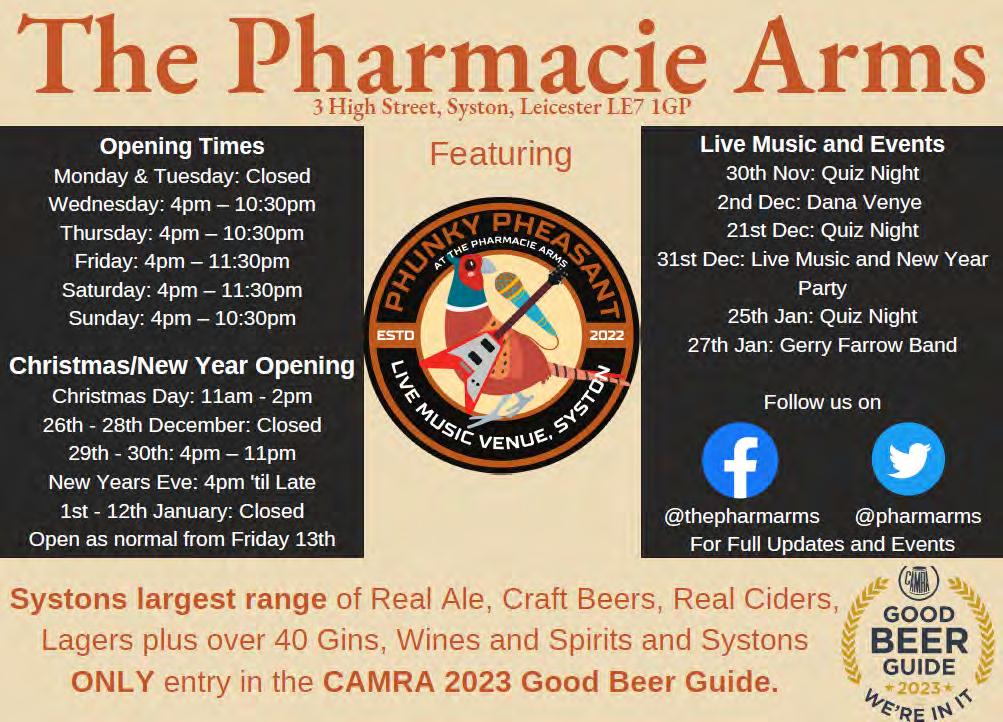 Foraninitialfreeappointment contactyourlocaladvisor on 01162698008 07827774445 A&AMORTGAGESLtd Abrokerfeeof£499willbechargedoncompletion. YOURHOMEMAYBEREPOSSESSED IFYOUDONOTKEEPUPREPAYMENTSONYOURMORTGAGE INDEPENDENTSPECIALISTSIN BMW & MINI VEHICLES SERVICESFOR MINI VEHICLES SERVICESFOR BMW VEHICLES SERVICESFOR AUDI VEHICLES || 01162766608 | www.garage786.co.uk | 105aBarkbyRoad, Leicester.LE49LG SYSTONTOWNNEWS ©1996 VOL.26No11DEC2022/JAN2023ISSN2045-0974 SYSTON’SONLYINDEPENDENTCOMMUNITYNEWSPAPER 18TheGreen, Syston. LE71HQ www.englishcouture.co.uk Tel: 01162606767 Nowopenforallyourdressmaking andsewingneeds ‘LadiesCoutureTailoring’ booknowavailable Coursesnowrunning Coursebookingscanbemadeviathe websiteorpopintotheshop Openingtimeswhennotinclass10am-3pm Newbrochureavailableintheshop RememberingThoseWhoGaveTheirTomorrowforOurToday YOURLOCAL BATHROOM, TILING& SHOWER SPECIALIST ReliableandProfessionalService over25yearsexperience Nojobtoosmall•Allworkguaranteed Souter BathroomsLtd CallDarrenTel:01162604105 Mobile:07766685901