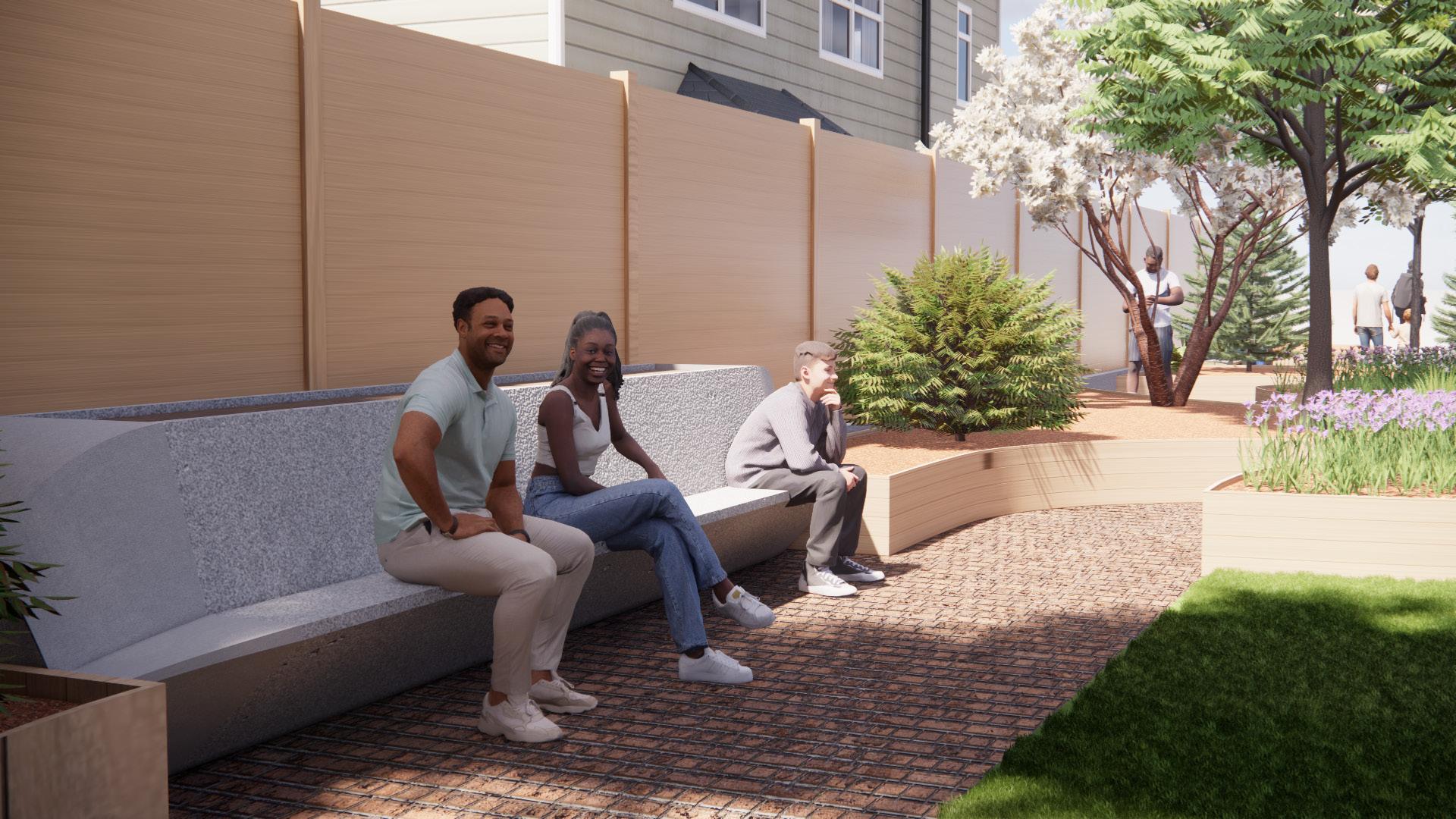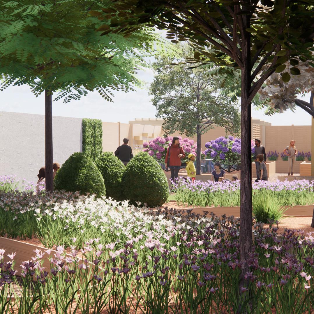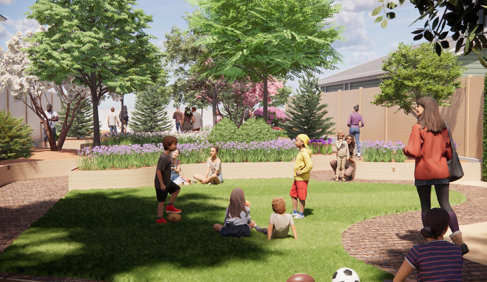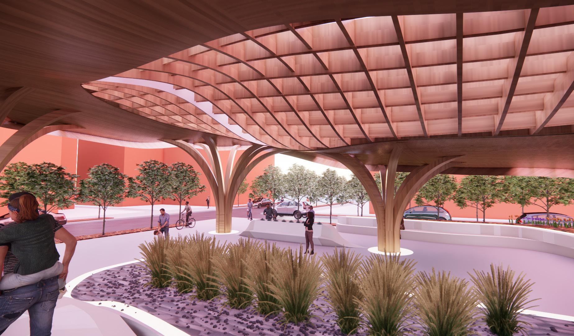 It was decided to use the preexisting curvature of the flower beds to create a stage, lawn, and curved seating that the community could use for gatherings and events. It would also call for the creation of a custom gazebo structure to house the community garden program, which looks to teach residents how to plant crops in an area where food scarcity is a significant issue.