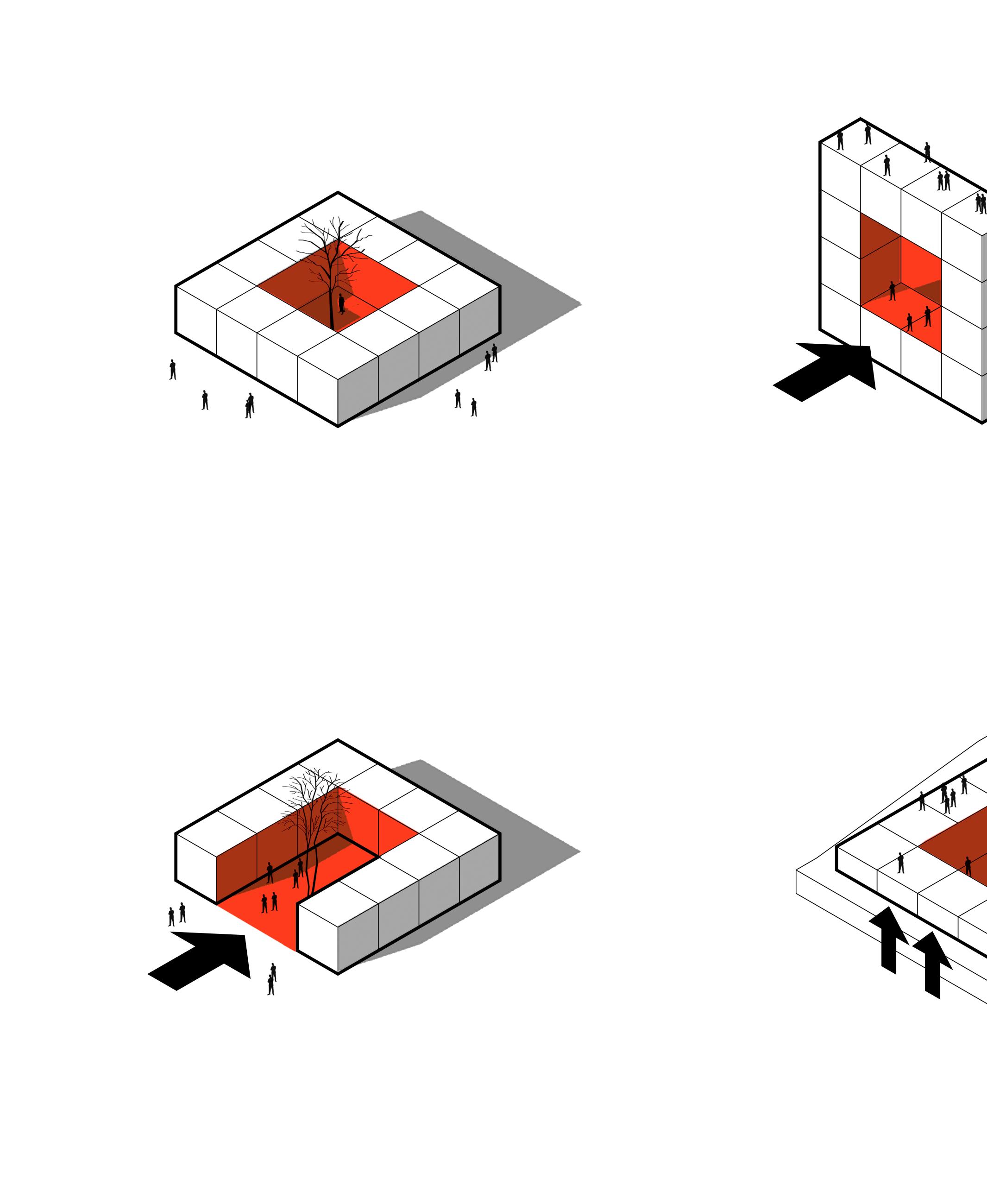 Ajustar las alturas y la volumetría con respecto al contexto. El volumen mas alto se deja sobre la vía principal que es de gran flujo y los mas pequeños directamente relacionados con el río y la vegetación.