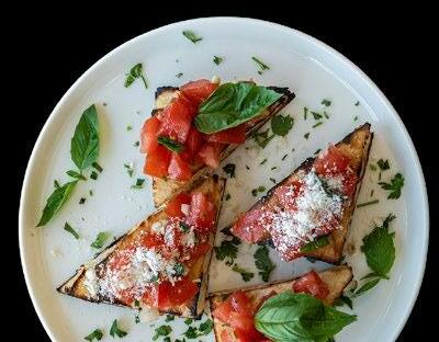 paradicsom, lilahagyma, parmezán, vörösborecet, extra szűz olivaolaj, római pizzaszeleten | tomato, red onion, parmesan,