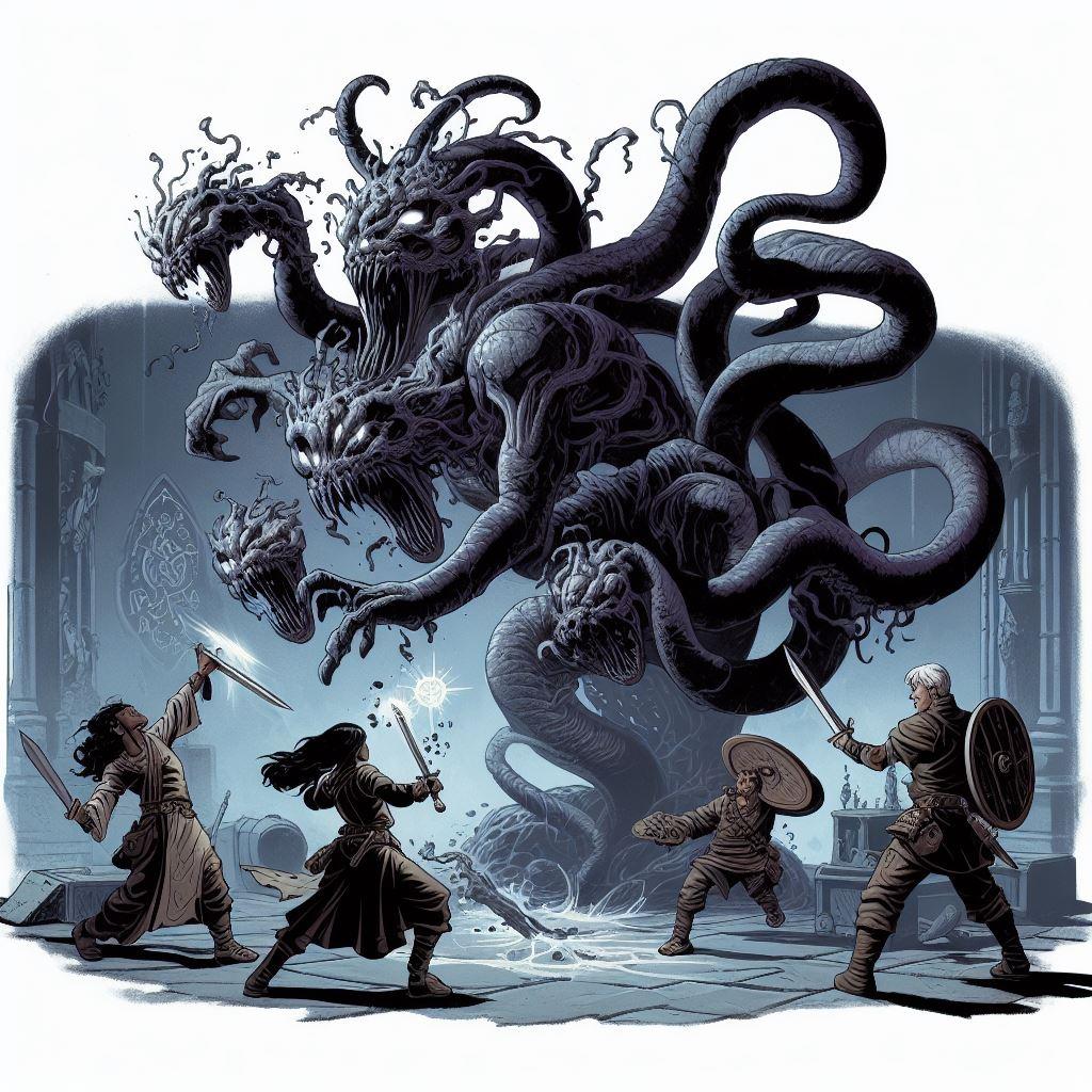 As you step into the heart of the temple, the ambient shadows begin to churn and coalesce, drawn from the very stones and shadows of the chamber towards a singular point in the chamber's center What once was dispersed darkness starts to rise, amassing into a towering and formidable form a swirling mass of darkness and fury, intent on consuming all that stands before it.. From its central mass, several swirling, head-like appendages emerge, each one seeming to scan the room with an otherworldly intent.