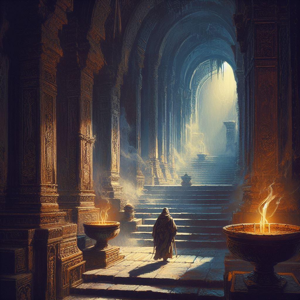 Prompting Dialogue: "What brings you to this temple? Are you seekers of truth, or merely treasure hunters?"