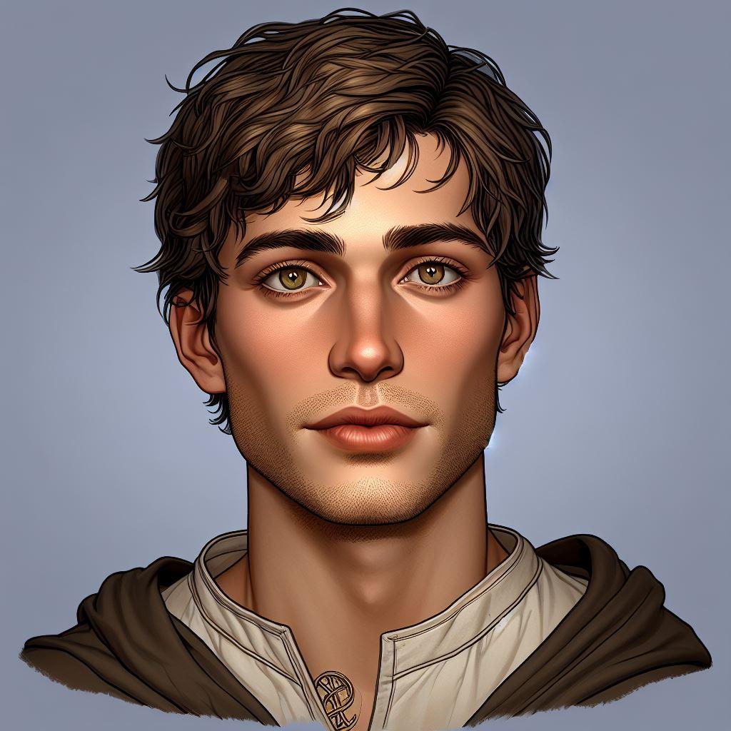 Description: A broad-shouldered youngish man with a handsome face and cunning eyes, clad in leather armor adorned with mysterious symbols, studies you intently from across the room.